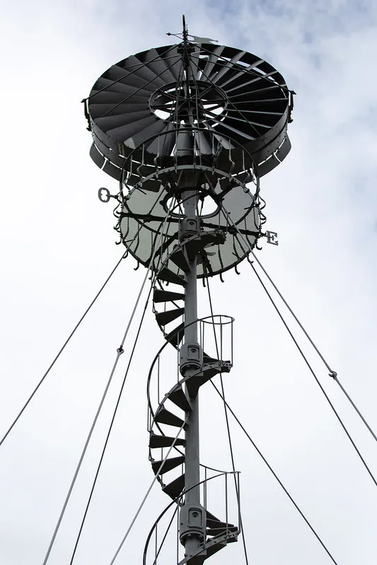 This type of wind turbine, the Bollée wind turbine, was conceptualized by Ernest Sylvain Bollée and was used to pump water. Today in France only about forty wind turbines of this type remain visible.
