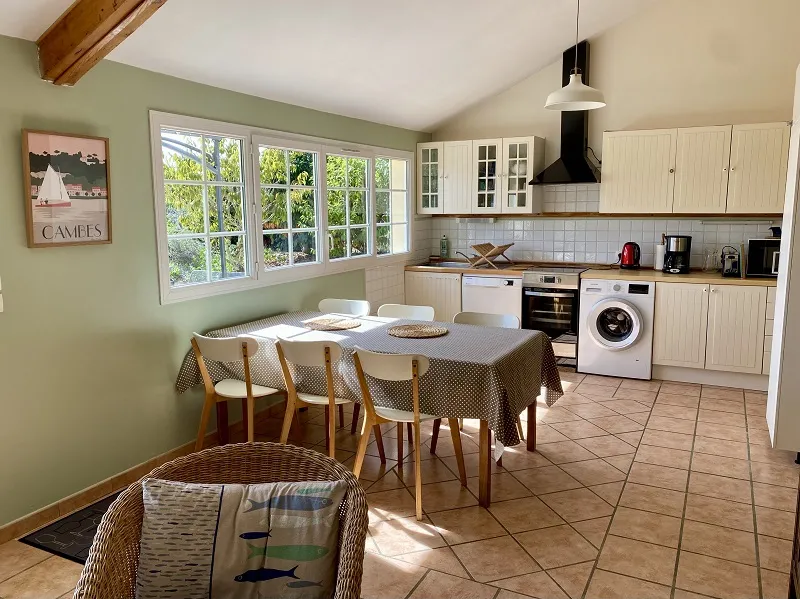 HOUSE. 130 m². First floor and ground floor. 4 bedrooms, 2 double beds, 2 single beds, each bedroom with private shower room and wc. Living room/dining room, telephone, colour TV, kitchenette, washing machine, dishwasher, micro wave. Garden, garden furniture, barbecue. Private parking. Shared swimming pool.