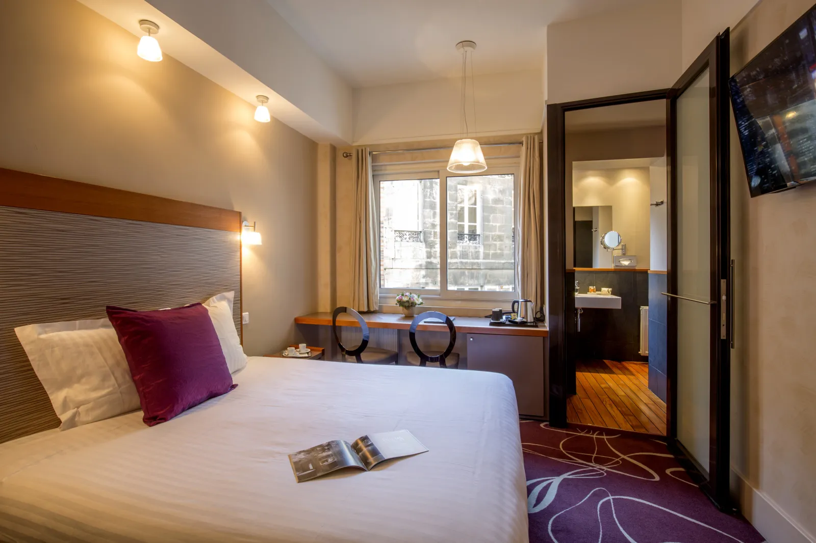 The windows of the Hôtel de Normandie offer a view of Bordeaux’s famous Esplanade des Quinconces, a short distance from the Grand Théâtre and the Place Tourny square.