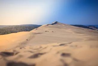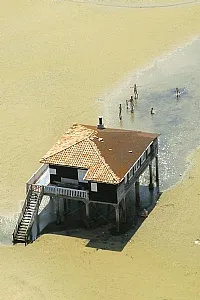 The Bassin d'Arcachon is located in the heart of the Landes de Gascogne. It is triangular in shape, bounded by more than 80 km of flat coastline or wooded dunes. It is widely open to the Bay of Biscay and the tide brings in and out twice a day considerable masses of water. The Basin is partially isolated from the ocean by a dune belt including Cap Ferret, the Dune du Pilat and the Banc d'Arguin. The opening to the Atlantic Ocean is made by a unique access, the "passes", a set of channels about 3 km wide allowing the circulation of water between the basin and the ocean. In the centre of the basin is the Île aux Oiseaux and its chalets.