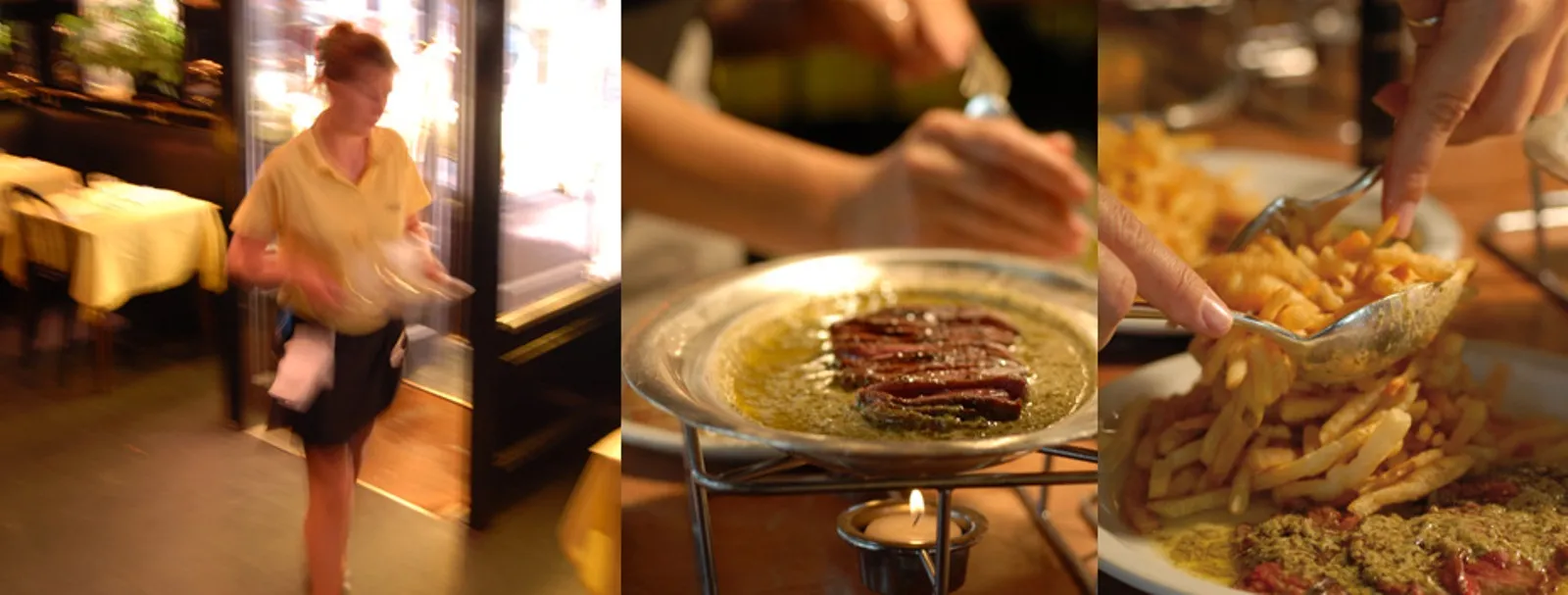 Since 1959, the single course formula has remained unchanged. This formula consists of a 170 grams slice of rib eye trimmed with fries and its famous sauce.