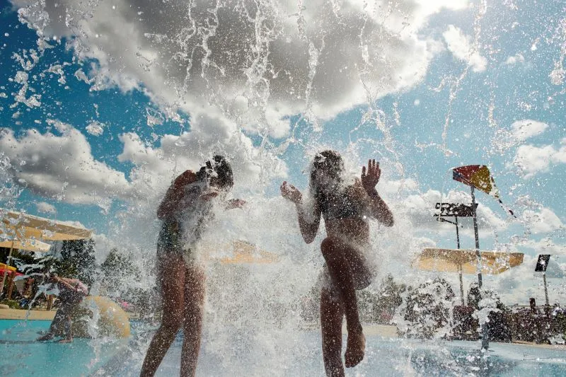 Outside, the water park is open only in summer, and is embellished with mineral beaches, a solarium lawn and green spaces.