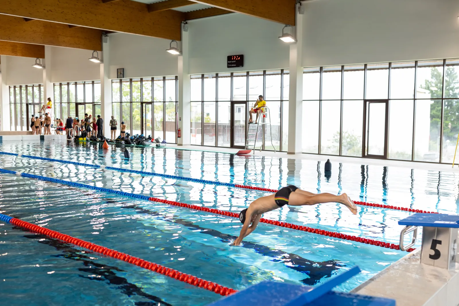 -the first is dedicated to sports activities: a 375 m² pool with 6 swimming lanes (25*15m), with a depth of up to 3m for scuba diving training.