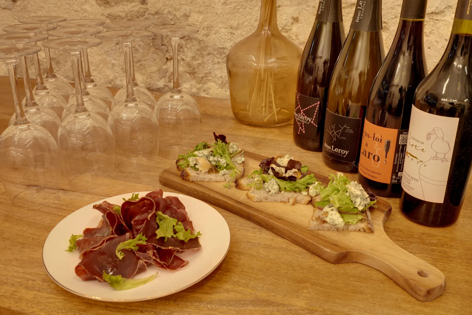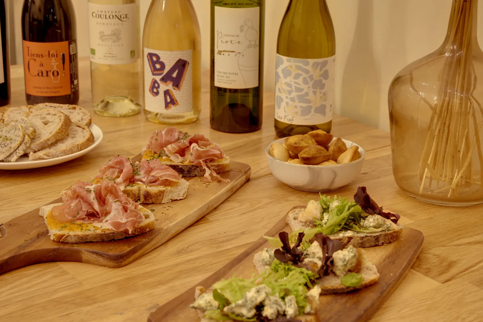 Discover the different French grape varieties through our range of carefully selected « live » wines & accompanied by various cold meats (Beef, Iberian Bellota), regional cheeses, pintxos, local homemade spreads.... All accompanied by our homemade sourdough breads to delight your taste buds.